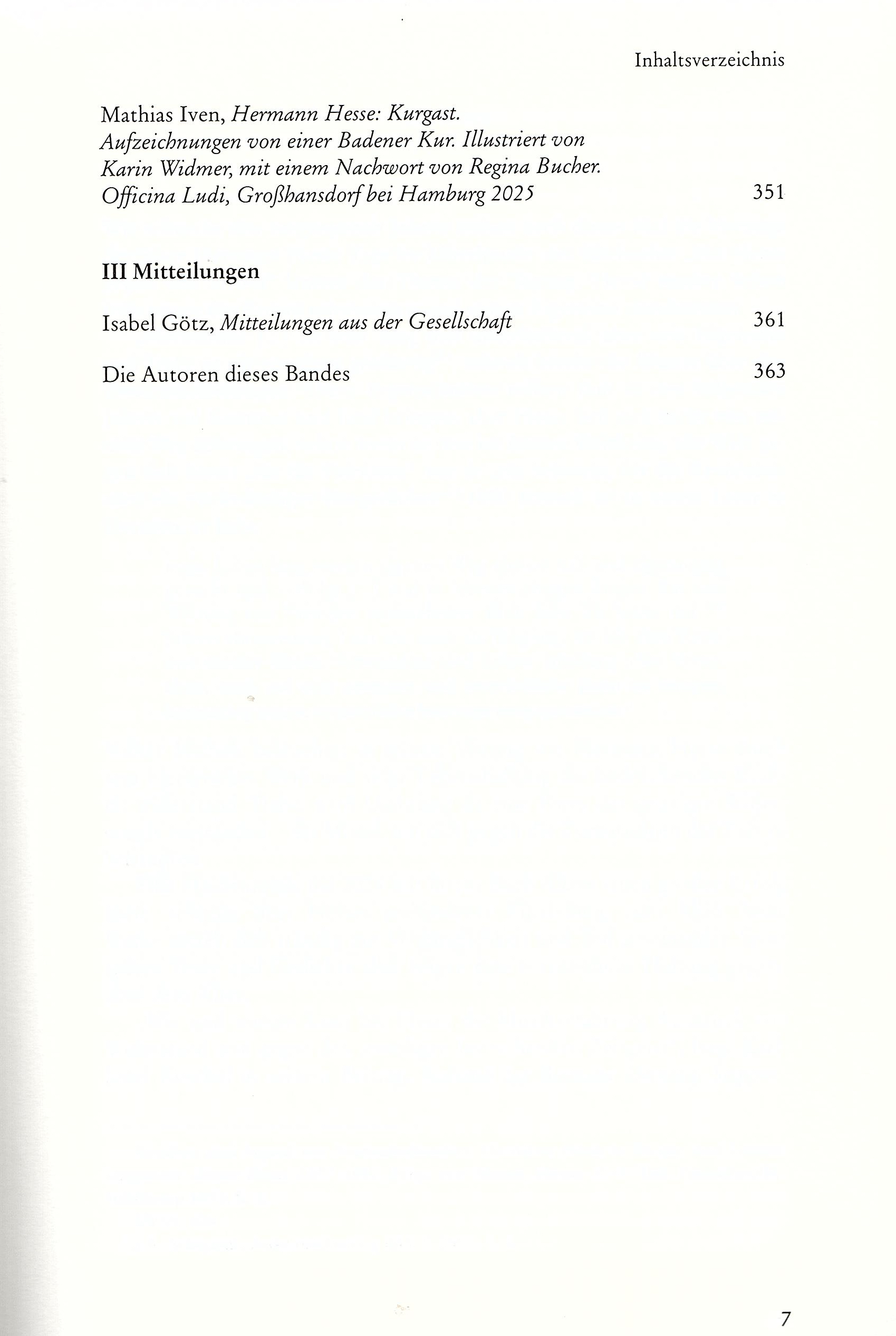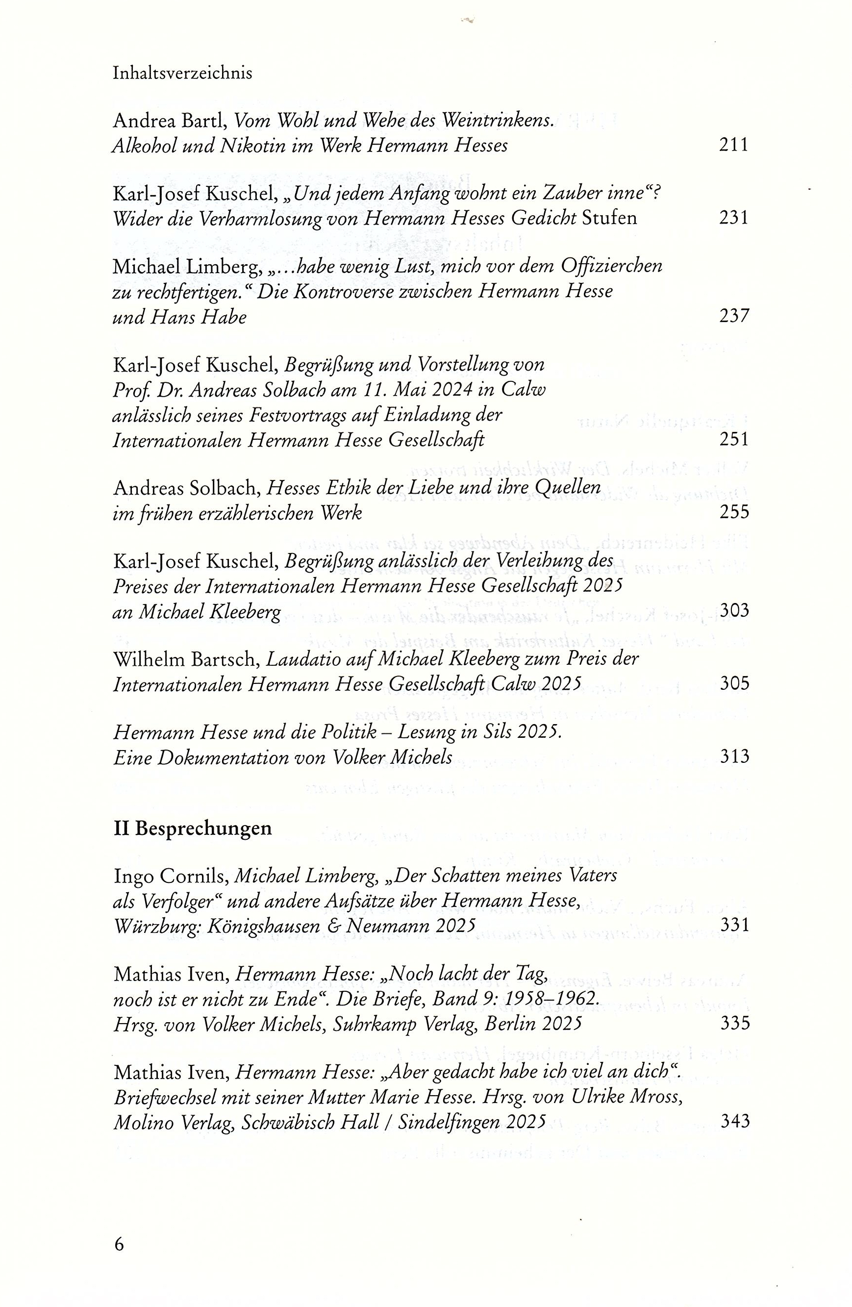 Soeben ist der Band 18 des von Michael Limberg im Auftrag der Internationalen Hermann-Hesse-Gesellschaft herausgegebenen "Hermann-Hesse-Jahrbuchs" erschienen. Dieses enthält zahlreiche neue Beiträge aus den Jahren 2024 und 2025 zur Erforschung von Leben und Werk Hermann Hesses, die unter anderem bei den Silser Hesse-Tagen und den Jahresversammlungen der Hesse-Gesellschaft gehalten wurden. Das Inhaltsverzeichnis des 364 Seiten starken Bandes kann hier eingesehen werden: