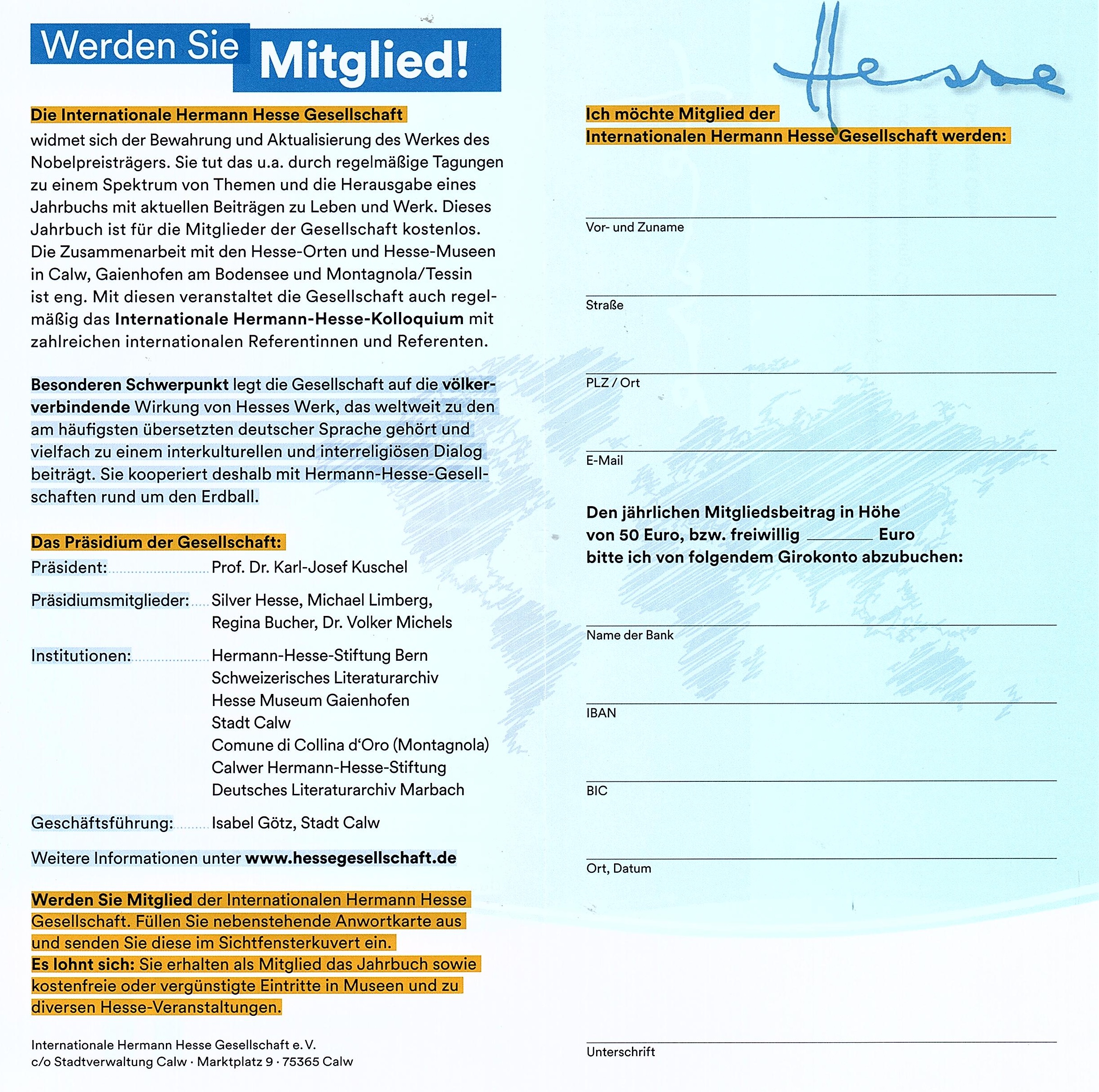 Mitgliedern der Internationalen Hermann-Hesse-Gesellschaft wird das Jahrbuch kostenlos zugesandt, da es im Jahresbeitrag enthalten ist. Informationen über die Hesse-Gesellschaft und die Mitgliedschaft in ihr enthält der folgende Informations-Flyer: