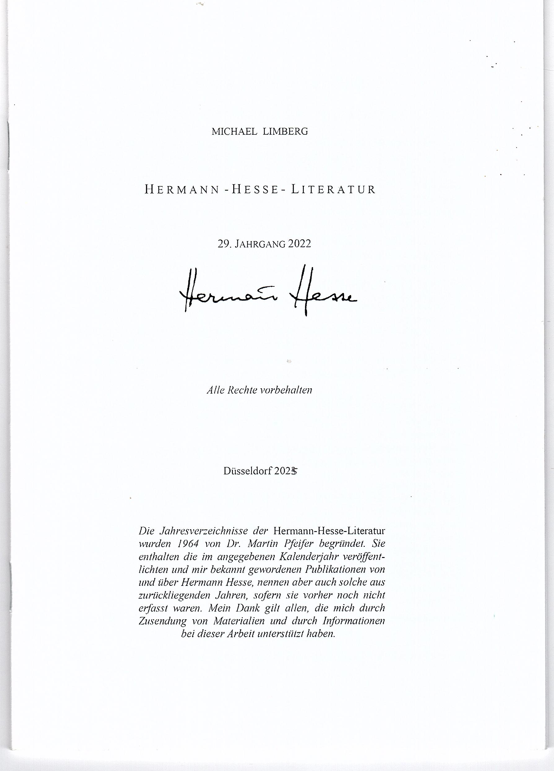 Michael Limberg, der seit Mitte der 1990er-Jahre die von Dr. Martin Pfeifer 1964 begründeten Jahresverzeichnisse der Hermann-Hesse-Literatur betreut, hat soeben die Jahresbibliografie für 2025 vorgelegt. Sie zeigt die nach wie vor große Vielfalt von Aktivitäten rund um das Leben und Werk Hermann Hesses und kann hier eingesehen werden: