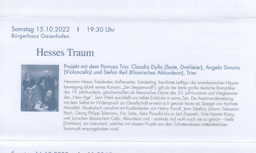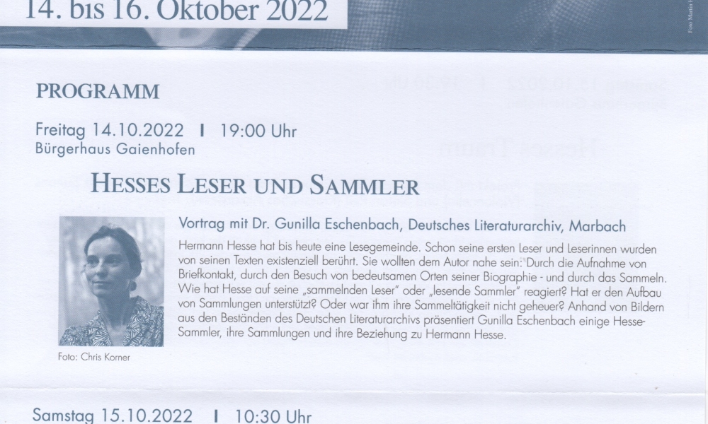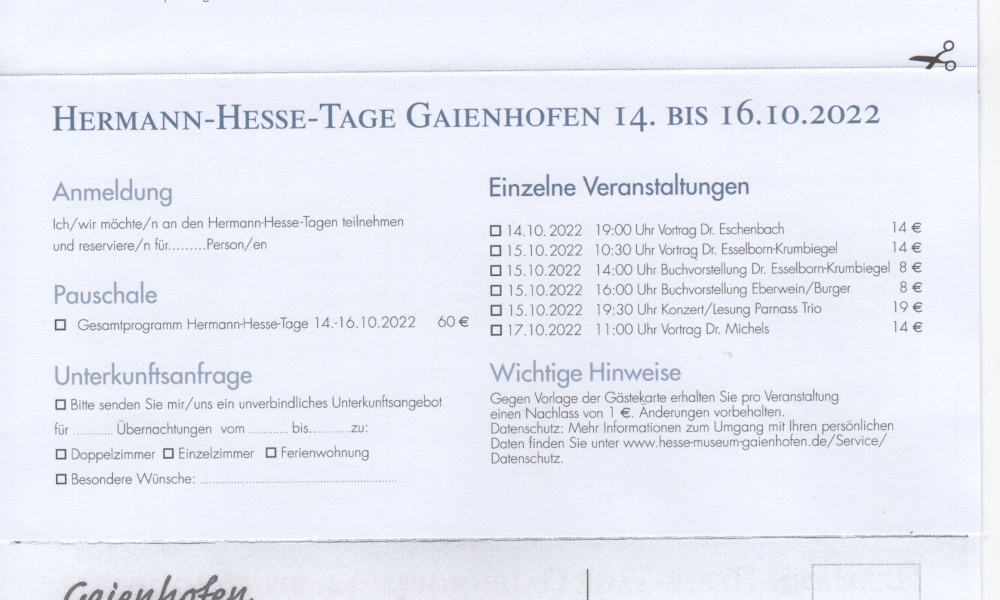 Neue Leiterin ist nun die ebenfalls promovierte Kunsthistorikerin Yvonne Istas, die bis 2017 das Stadtmuseum Stockach leitete und seither das Stadtmuseum Rosenegg im schweizerischen Kreuzlingen. Zu den anstehenden Aufgaben der 57-Jährigen wird auch die Durchführung der diesjährigen Gaienhofener Hermann-Hesse-Tage gehören, die vom 14. bis 16. Oktober im Bürgerhaus Gaienhofen stattfinden werden. Das Programm und die Organisation sind den folgenden Scans zu entnehmen: