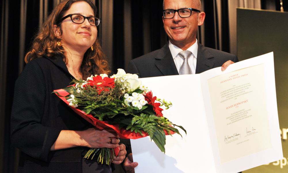 Laudator Denis Scheck führte ebenso humorvoll wie sprachgewandt in die Kunst des literarischen Übersetzens im Allgemeinen und Susan Bernofskys im Besonderen ein. Vor dem Hintergrund, dass der transatlantische Literaturaustausch zur Einbahnstraße geworden sei und in der Verlagsmetropole New York immer weniger Lektoren Deutsch läsen, werde „die eminente Bedeutung von Susan Bernofsky für die deutschsprachige Literatur in den USA“ klar. In ihrer preisgekrönten Neuübersetzung von Siddhartha nutze Bernofsky bei der Übertragung von Hesses „kurzen, wohlkalkulierten Sätzen, kristallklar und schlicht“ „souverän ihren Platzvorteil, nämlich die Silbenknappheit des Englischen.“ Hier sitze jedes Wort, „keine Silbe zuviel, kein rhythmischer Atemzug, das ist Hesse im asketischen Samana–Modus.“